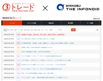 2021年1月,正式向丸三證券提供股票數(shù)據(jù) 2021年1月4日 株式會社みんかぶ與丸三證券聯(lián)手,為投資者推出了名為「MINKABU for 03trade」的服務(wù),為更多的個(gè)人投資者提供快速、準(zhǔn)確、全面的金融服務(wù)。